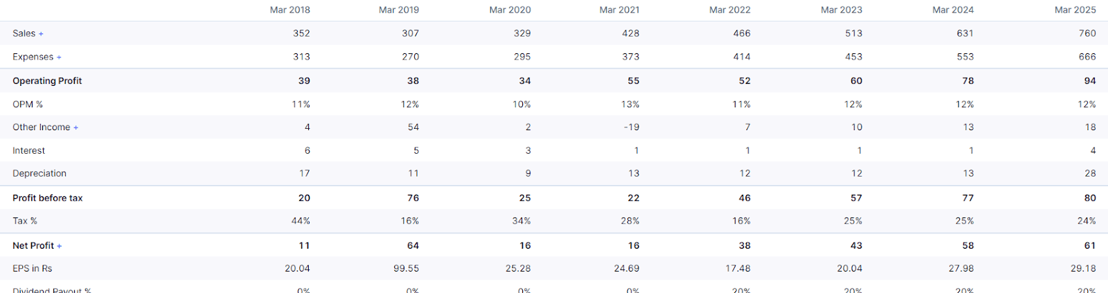 Revenue has grown from ₹352 Cr in FY18 to ₹760 Cr in FY25 — a CAGR of ~11.5%.