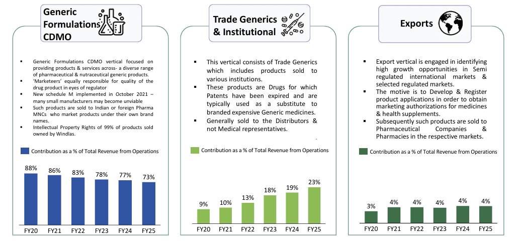 The company caters to over 5,500 brands and maintains relationships with 7 of the top 10 Indian pharmaceutical formulation companies. Windlas is vertically integrated across formulation development, licensing, commercial manufacturing, and packaging. The company’s evolution is marked by milestones such as: